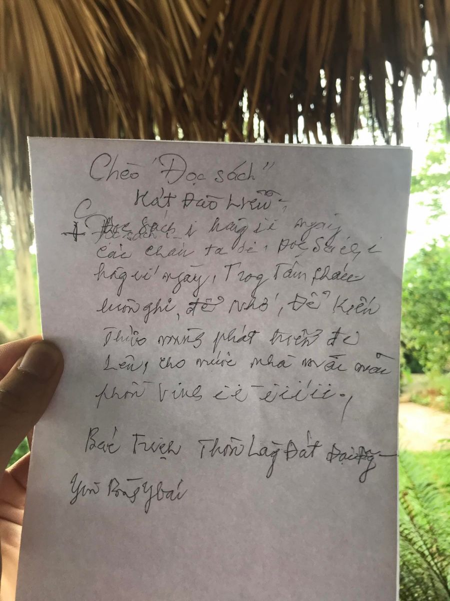 Tháng vừa rồi chúng tôi may mắn có đoàn thiện nguyện Xoxo về tổ chức khuyến đọc, hỗ trợ gia đình khó khăn và tặng rất nhiều sách cho các cháu nhỏ. Khác với các đoàn khác, tôi thấy chúng tôi nhận được nhiều thứ hơn ngoài những món quà hay tiền. Nhìn các cháu vui vẻ tham gia trò chuyện, nhận sách, rồi cả những cháu nói rằng mình muốn có một tủ sách trong nhà hay muốn lớn lên làm việc như các cô chú Xoxo mà tôi dưng dưng nước mắt. Chỉ mong rằng ngọn lửa này được giữ lại càng lâu càng tốt. Bài chèo “Đọc sách” - hát đào liễu này, tôi và cháu Việt Anh ngồi sáng tác trong lúc tổ chức chương trình để cuối buổi dành tặng các cháu nhỏ như lời nhắn nhủ các cháu phải giữ được ngọn lửa mà cô chú Xoxo đã trao, phải biết cố gắng học tập, vươn lên trong cuộc sống.