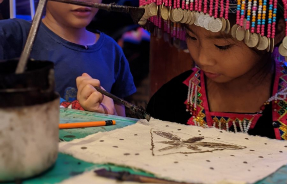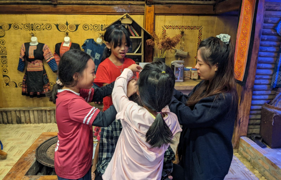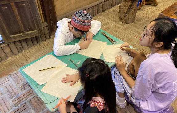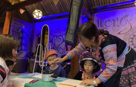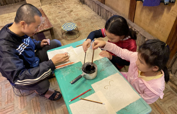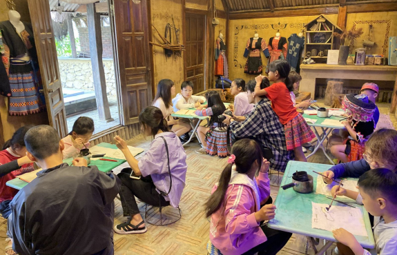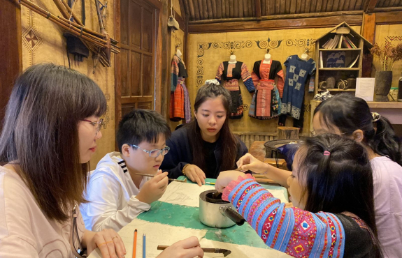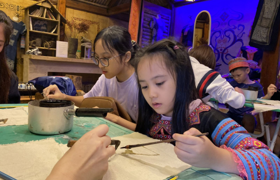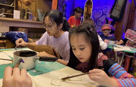 Rồi tham quan vườn mận, vườn su su, trông vậy mà vui lắm. Sau đó về lại bản, được trải nghiệm vẽ sáp ong vô cùng thú vị. Các bạn nhỏ và đoàn lần đầu tiên được vẽ nên thích lắm. Mỗi người đều có 1 sản phẩm mang về. Tối đến, ăn bữa tối ngon lành xong, chúng mình đi chợ đêm. Tại chợ đêm Pà Cò, được hiểu hơn về văn hoá địa phương, được xem các tiết mục văn nghệ của người Mông, là một trải nghiệm khó quên với chúng mình. Không chỉ tham gia chợ đêm, chúng mình còn tự đốt lửa, ngồi quây quần và hát hò đến tối muộn. Anh Công có mang theo chiếc đàn guitar nên cả đoàn có dịp trổ tài.